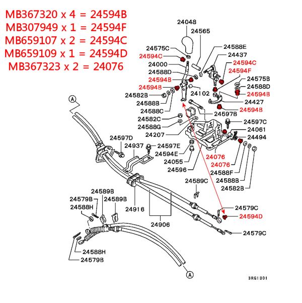 Kit Contains Mitsubishi Part Numbers + Locations on Diagram MB367320 x 4 = 24594B MB307949 x 1 = 24594F MB659107 x 2 = 24594C MB659109 x 1 = 24594D MB367323 x 2 = 24076
