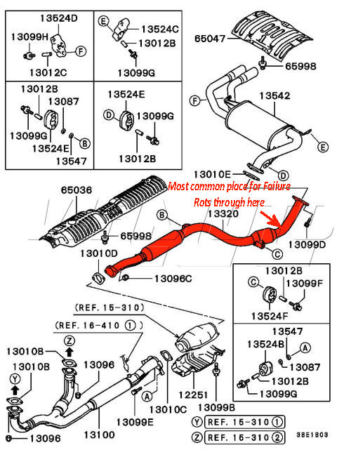 Exhaust Middle Section - Mitsubishi FTO 1.8/2.0 DE2A DE3A GS/GR Non Mivec Models These have a nasty habit of rusting at the welded join where it rises up to the back box as water collects at this point. Exploded Diagram HERE shows location of most failures. Mitsubishi Part Numbers MR160272 MR355247