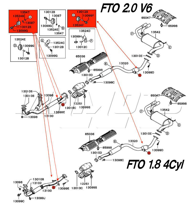 One Exhaust Rubber Mount Hanger for Middle Section & Frontpipe on an FTO - ALL Models Aftermarket ONLY Available Now OEM One Discontinued They use one on the rear of the middle section of exhaust and two on the frontpipe. See Exploded Diagram for locations HERE Mitsubishi Part Numbers MB906128 MB577484 MR906129