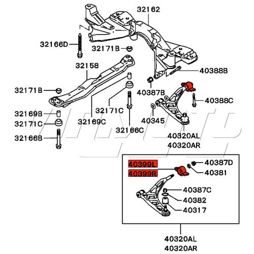 Front Bottom Arm Rear Bush including bracket - Mitsubishi Lancer Evolution II / III CE9A Exploded diagram HERE Mitsubishi Part Number LH = MR130235 RH = MR130236