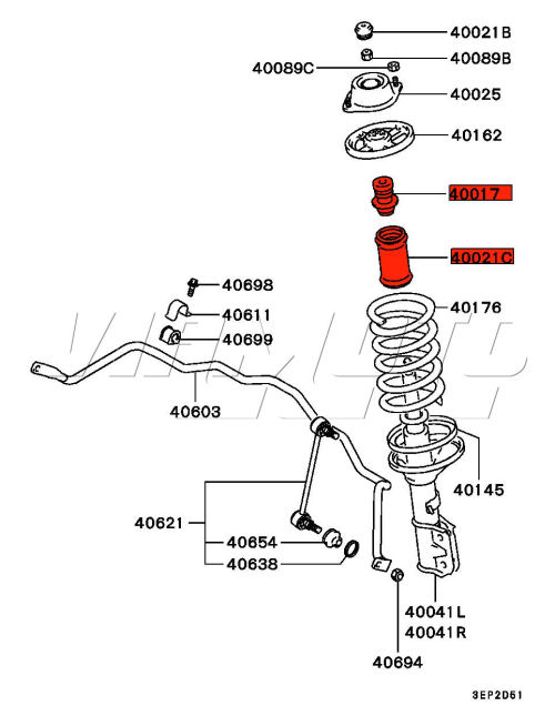 Front bump Stop and Dust Cover Set - Mitsubishi Lancer Evolution II / III CE9A Choose from Aftermarket or OEM Mitsubishi Items Exploded Diagram HERE Kit Contains :- 2 x Bump Stops and 2 x Dust Covers Mitsubishi Part Number MB518957 or MR333831 MB303070