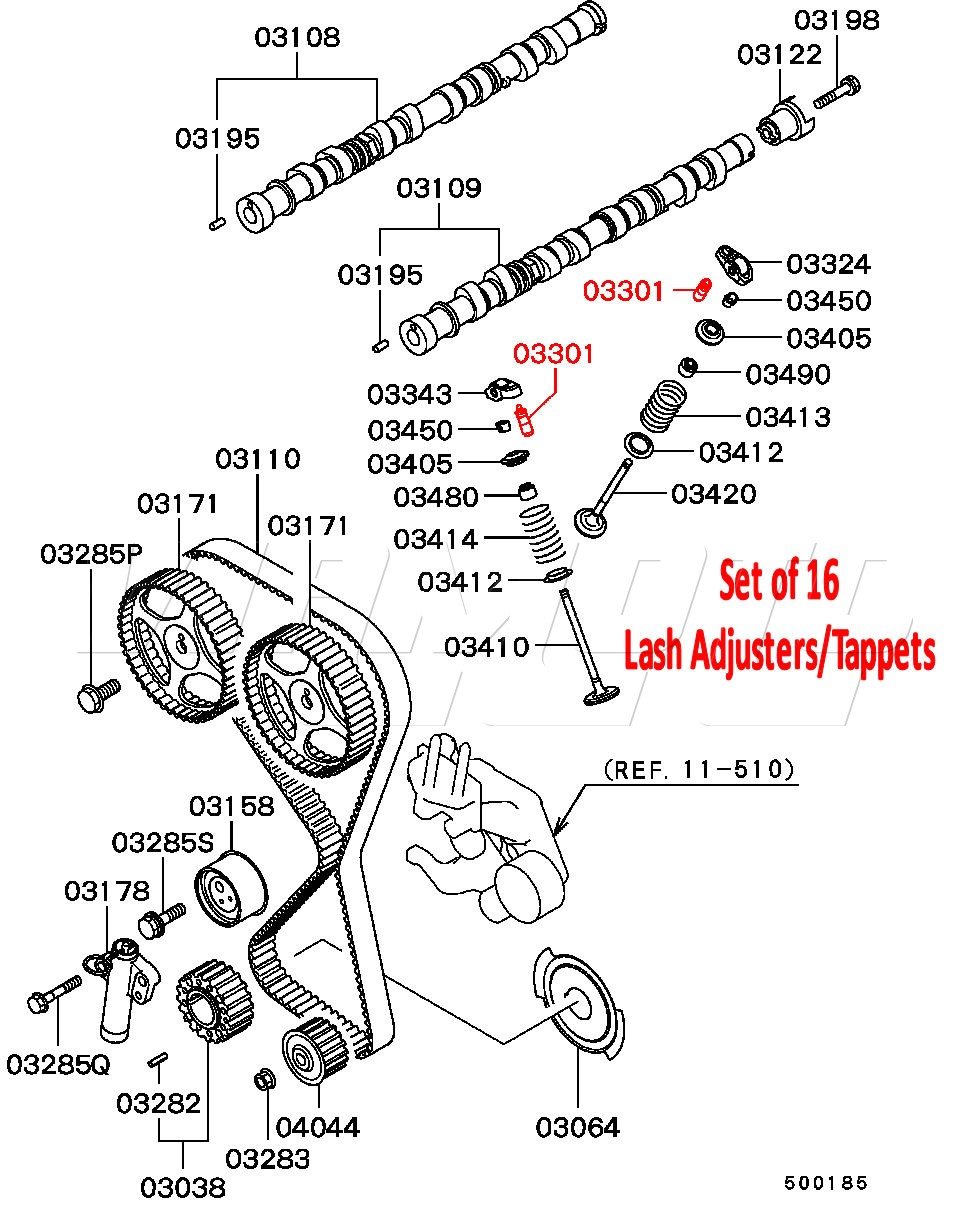 Lash Adjusters/Hydraulic Tappets x 16 for Mitsubishi Airtrek 2.0 Turbo-R 4WD CU2W 4G63T Full Set of 16 These are the later type with 3mm oil hole. Tappets are pre oiled ready for installation. Exploded Diagram HERE Each and every Tappet is inspected for defects, hole size etc These are quality manufactured parts unlike some of our competitors We buy in the 1000's to get the best possible price. We then inspect each and every one for correct operation, hole size & burrs/poor finish. If any defects are found the tappet is discarded. Tappet Info & Bleeding Instructions HERE Mitsubishi Part Numbers MD124739 MD149309 MD337687 MD377054 85004200 2461039100 2461033050 EAN:- 84 27769 45510 0