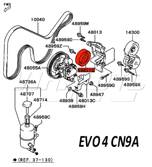 Power Steering Idler Pulley - Mitsubishi Lancer Evolution IV CN9A Exploded Diagram HERE showing location. Choose from Aftermarket Copy or Genuine Mitsubishi Part Mitsubishi Part Number MD327654