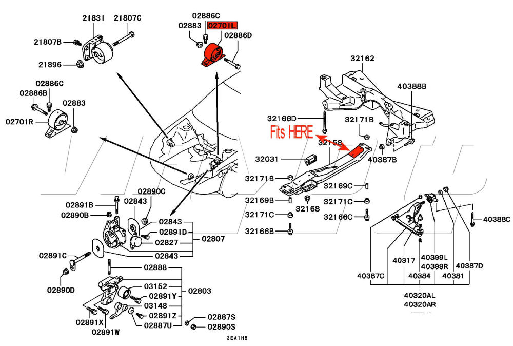 Rear Engine Mount - Engine Roll Stop - Mitsubishi Lancer Evolution I CD9A The one that sits at the rear on the engine cradle If the engine rocks front to rear this is one of 2 mounts that may need changing. See Exploded Diagram HERE Mitsubishi Part Number MR103555