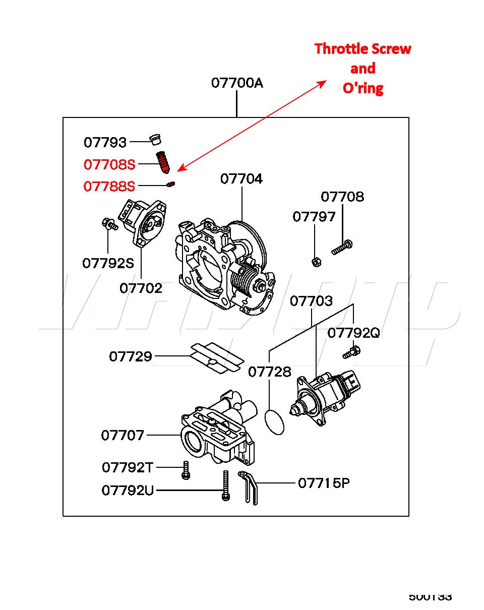 Throttle Body Idle Adjusting Screw Kit - Lancer GSR 1.8 4WD Turbo CD5A The one that adjusts the engine idling. The screw is made of a hard type of brittle bakelite plastic, the aluminium has a nasty habit of corroding around it and it gets stuck in the hole so you end up destroying the screw head trying to adjust the idle. The o ring fits on the top of the screw. Kit Consists :- Adjusting Screw O'Ring For Throttle Body Exploded Diagram Click HERE Mitsubishi Part Numbers MD614948 Screw MD608806 O ring