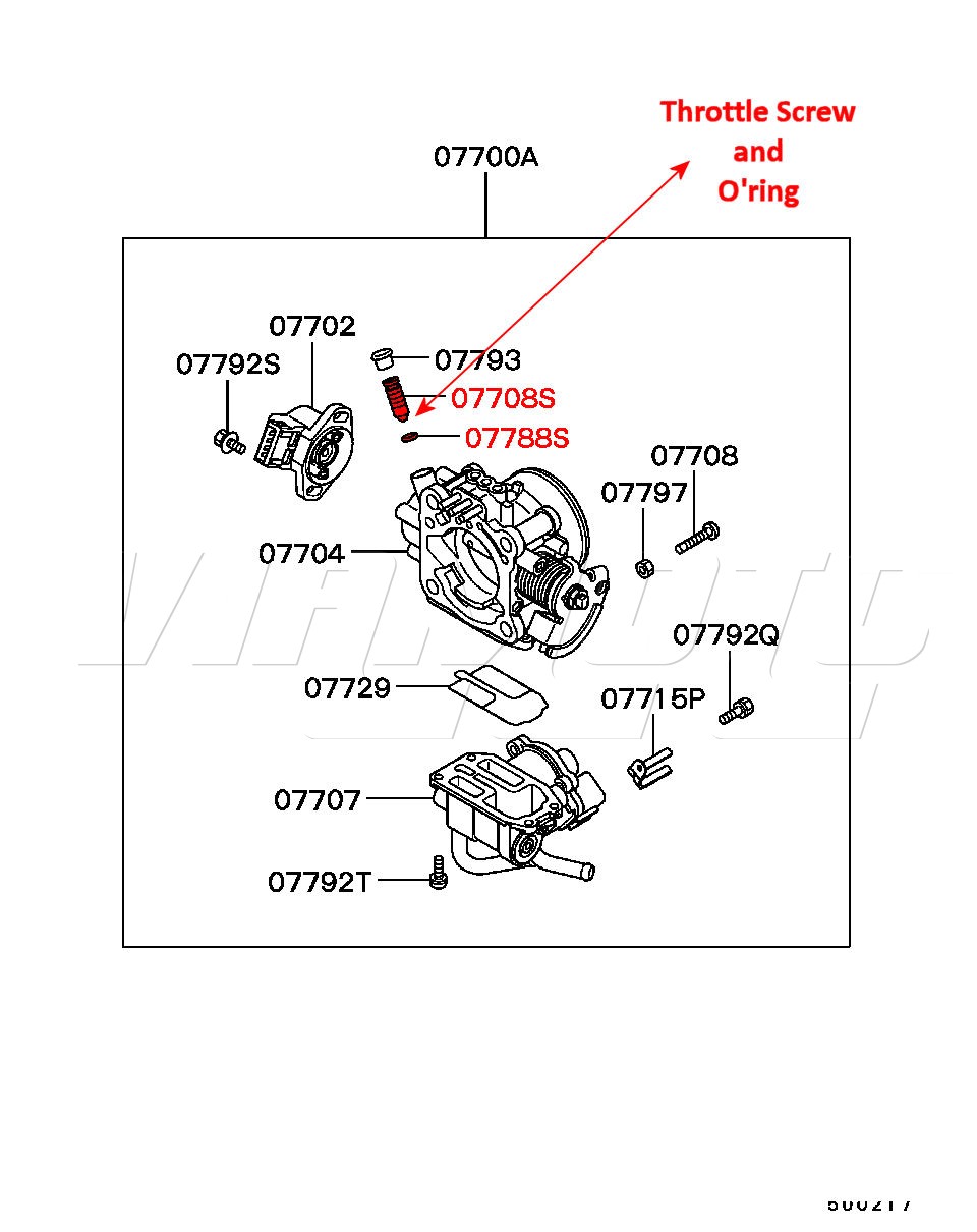 Throttle Body Idle Adjusting Screw Kit - Mitsubishi Colt 1.8 GTI CA5A The one that adjusts the engine idling. The screw is made of a hard type of brittle bakelite plastic, the aluminium has a nasty habit of corroding around it and it gets stuck in the hole so you end up destroying the screw head trying to adjust the idle. The o ring fits on the top of the screw. Kit Consists :- Adjusting Screw O'Ring For Throttle Body Exploded Diagram Click HERE Mitsubishi Part Numbers MD614948 Screw MD608806 O ring