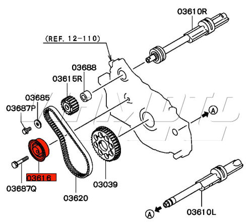 Timing Belt Tensioner Bearing - Cambelt Tensioner Pulley - Mitsubishi Lancer Evolution 9 CT9A Exploded diagram showing Location HERE Mitsubishi Part Numbers MD182537 MD334548 MD369999