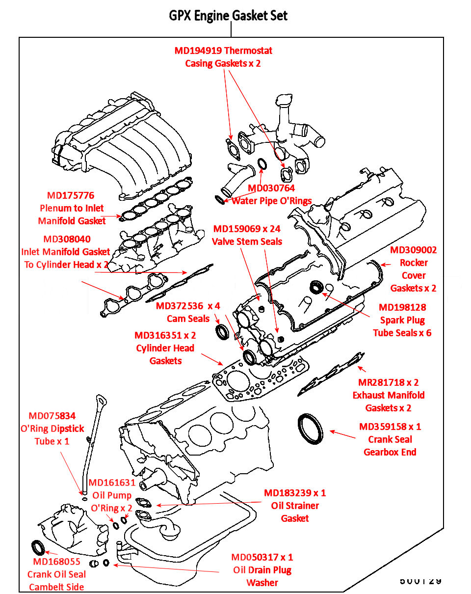 Head Gaskets x 2 MD316351 Exhaust Manifold Gaskets x 2 MR281718 Inlet Manifold to Cyl Head Gaskets x 2 MD308040 Inlet Manifold to Surge Tank Gasket x 1 MD175776 Spark Plug Seals x 6 MD198128 Rocker Cover Gaskets x 2 MD309002 Valve Stem Seals - Inlet x 12 MD184303 Valve Stem Seals - Exhaust x 12 MD302338 now MD307342 Crank Oil Seal Cambelt Side x 1 MD168055 Crank Oil Seal Gearbox Side x 1 MD359158 Camshaft Oil Seals x 4 MD372536 Water Pipe O'Rings x 2 MD030764 Oil Strainer Gasket x 1 MD183239 Sump Plug Washer x 1 MD050317 Oil Pump O'Rings to Rear of Pump Case x 2 MD161631 Thermostat Case to Cyl Head Gaskets x 2 MD194919 Oil Level Gauge O Ring to Sump Tube x 1 MD075834 Mitsubishi Part Number MD974020