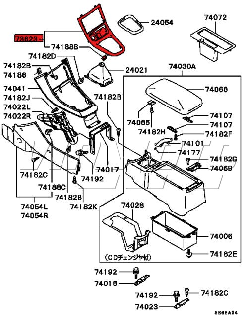 Centre Dash Console Gear Surround This plastic surround breaks frequently when removing the stereo. Or some nasty person breaks it for you! For Centre Console Exploded Diagram Click HERE Mitsubishi Part Number MR734441 (MR148721 is Stamped into Plastic)