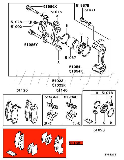 Front Brake Pad Shim Kit - Mitsubishi FTO GR/GS Single Piston Caliper Non Mivec Models The small shims are fitted to the piston side and the larger to the Outer pad in the caliper. Exploded diagram HERE Mitsubishi Part Number MR389655 4605B925