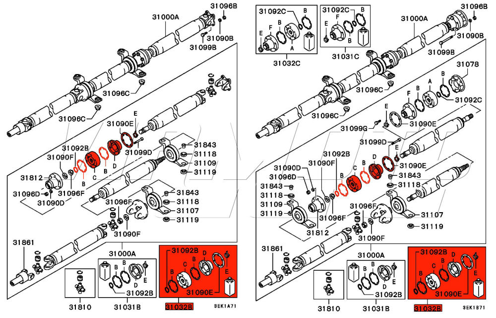 Front Joint Kit for Propshaft - Mitsubishi Lancer Evolution 5 6 CP9A This is a common propshaft shaking problem along with the bearing, bushes or poor propshaft alignment due to incorrect shimming. See location fitted HERE